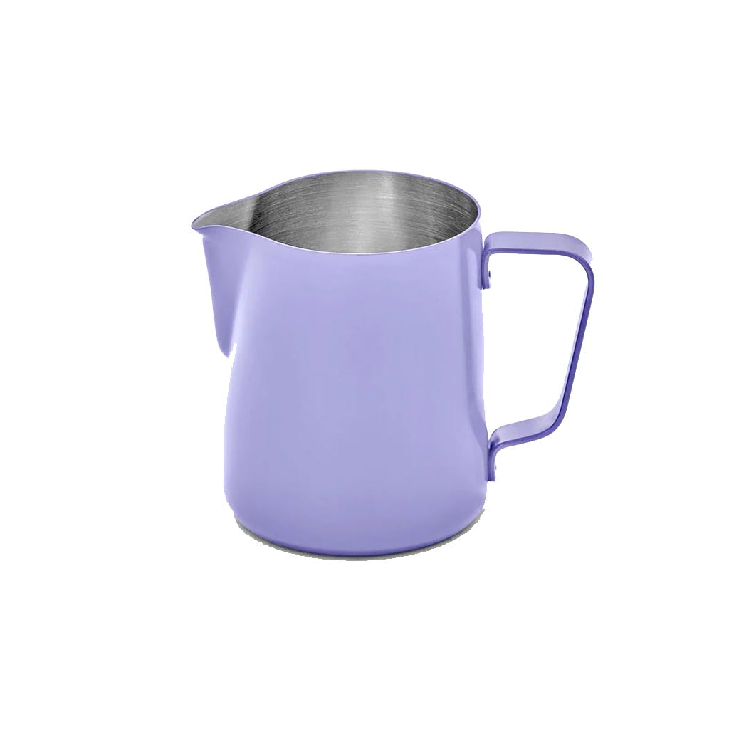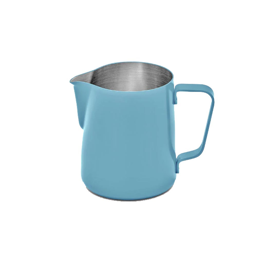 This Rhino Classic Milk Pitcher features a precision latte art spout, ergonomic handle, and commercial grade stainless steel, making it suitable for both commercial and domestic use. The exterior has a matte finish with a brushed stainless interior for a sleek look. Perfect for professional milk frothing.